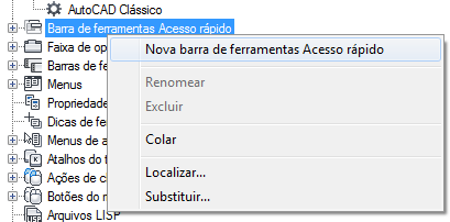 - Na guia Personalizar, no painel Personalizações em <nome do arquivo>, clique com o botão direito do mouse no nó Barras de ferramentas de acesso rápido. Clique em Nova barra de ferramentas de acesso rápido.