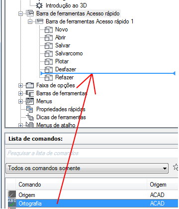 - No painel Lista de comandos, arraste o comando ou o controle que deseja adicionar à barra de ferramentas de acesso rápido no painel Personalizações em <nome do arquivo>.