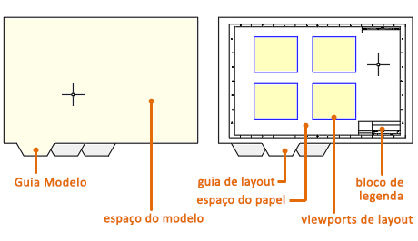A área dentro de um layout é chamada de espaço do papel, onde é possível adicionar um bloco de legenda, exibir vistas dimensionadas do espaço do modelo nas viewports de layout e criar tabelas, programações, notas e cotas para seu desenho.