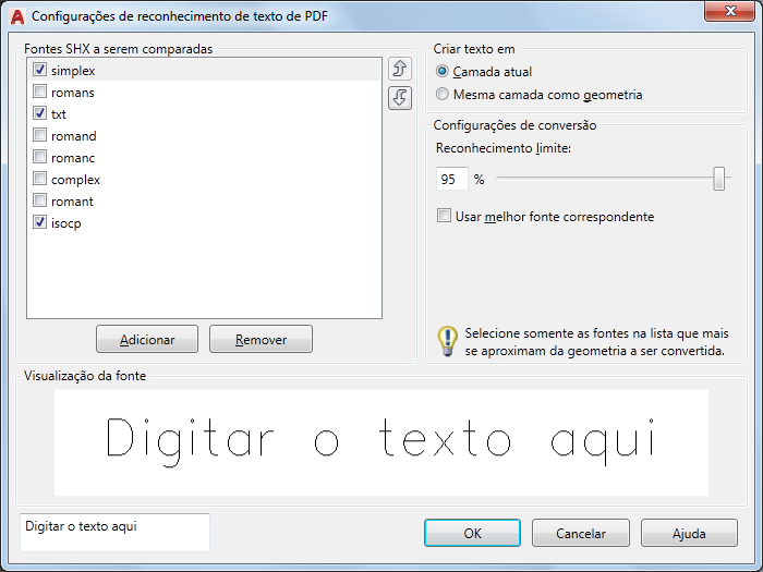 Exibe uma lista das fontes SHX na qual você pode selecionar as fontes que mais provavelmente coincidirão com a geometria SHX selecionada. A ordem das fontes SHX selecionadas é importante. As fontes selecionadas são comparadas à geometria SHX selecionada para uma correspondência iniciando na parte superior da lista até o Limite de reconhecimento especificado ser atingido ou excedido. Utilize os controles de seta para mover uma fonte selecionada para cima ou para baixo na lista. As fontes desmarcadas são ignoradas. Considere os seguintes pontos: