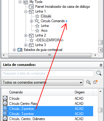 5. Arraste e solte um comando da lista de comandos para a linha, o subpainel ou o menu suspenso no painel.