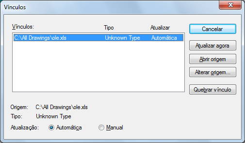 Rompe o vínculo entre o objeto e o arquivo original. O objeto no desenho é alterado para WMF (Formato de meta-arquivo do Windows), que não será afetado por alterações futuras no arquivo original.