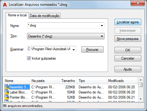 O tipo de arquivo a ser incluído na busca é determinado por tipo, de modo que não é necessário inserir uma extensão de arquivo em Named. Por exemplo, para localizar house102.dwg, insira house* e defina o Tipo como Desenho (*.dwg).