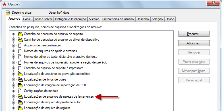 Os arquivos da paleta de ferramentas contêm ferramentas padrão e definidas pelo usuário. Os arquivos são armazenados nos locais especificados na configuração Localizações de arquivos de paletas de ferramentas.