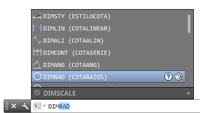 Se você começar a digitar o nome do comando ou variável de sistema na linha de comando, o recurso de preenchimento automático exibe as suas opções. Por exemplo, se você inserir cota, todos os comandos e as variáveis de sistema que começam com aquelas letras são listados.