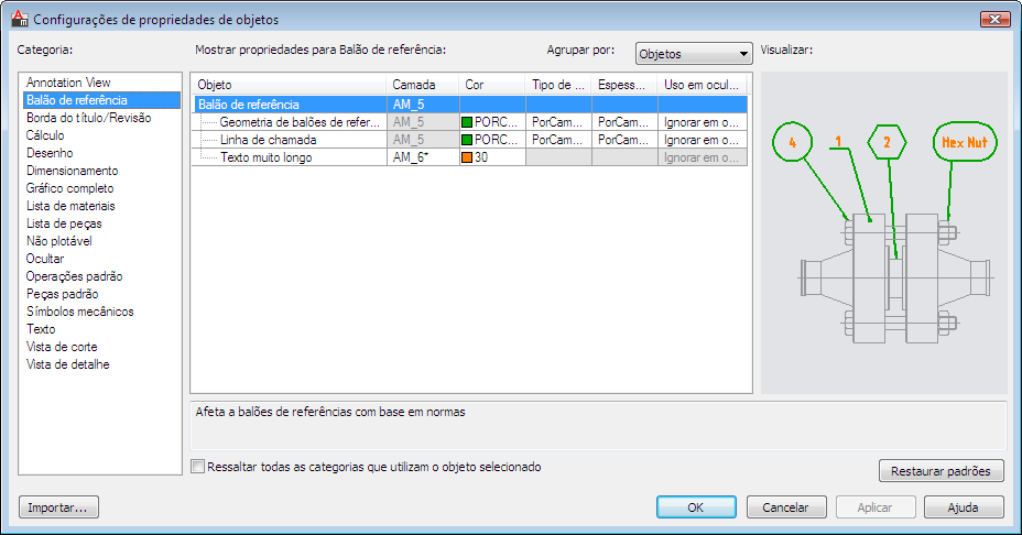 Na caixa de diálogo Configuração das propriedades do objeto, é possível predefinir as propriedades de objetos que os comandos do AutoCAD Mechanical criam.