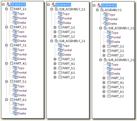 Cada componente possui ao menos uma vista de componente. Neste exemplo, o componente de montagem TROLLEY B ASSEMBLY possui duas vistas de componente.