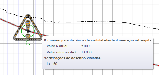 A curva ainda não atende o valor mínimo de k para a distância de visibilidade de ultrapassagem, então o os símbolos de aviso são exibidos. Para limpar um símbolo de aviso, a entidade deve atender a todos os valores especificados no arquivo de critérios de projeto e nas verificações de projeto aplicáveis.