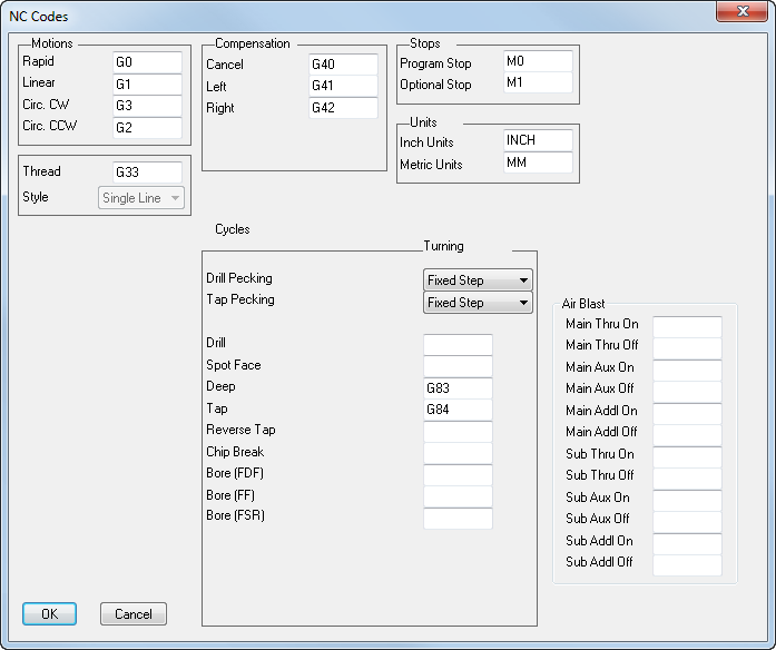 With the NC Codes dialog, the exact character strings that are required for commands by the NC machine for different motion types can be specified.