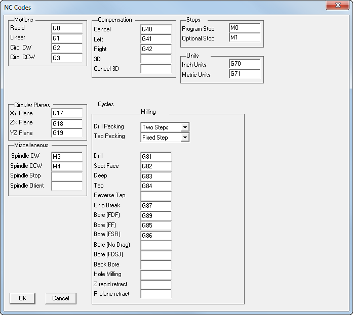 Motions — The options in this section describe motion types required by the NC machine. All of these codes must be specified.