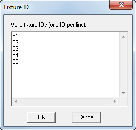 Records the various G codes that are valid fixture IDs. The Fixture ID dialog is displayed. You can type the appropriate IDs directly into the list, and click OK.