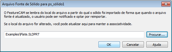 O FeatureCAM se lembra do local do arquivo a partir do qual um arquivo SolidWorks é importado. Se o arquivo fonte de sólido .sldprt for renomeado ou movido, você pode definir o novo nome e/ou local aqui para manter a associatividade.