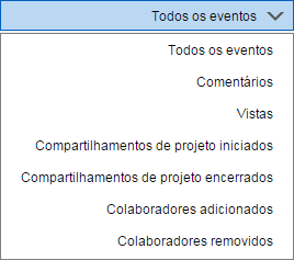 A guia Eventos no Painel Projeto conectado no A360 exibe todos os eventos de Compartilhamentos de projetos. Um evento é qualquer ação realizada por você ou seus colaboradores com os quais você compartilha Compartilhamentos de projetos.