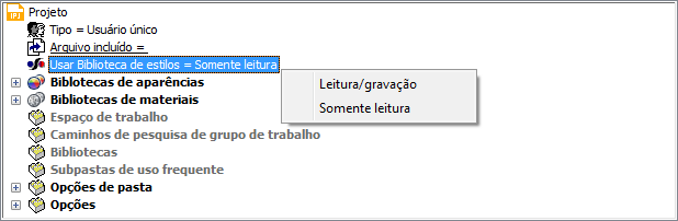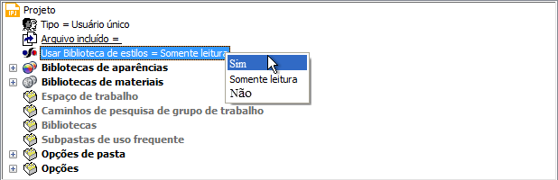 No Inventor 2012, a opção Usar biblioteca de estilos = Não foi removida das configurações do arquivo de projeto. A partir do Inventor 2012, se o estilo coincide com um estilo na biblioteca de estilos, nós automaticamente eliminamos todos os estilos dos documentos do Inventor. Se você definir um estilo personalizado com base em modelos personalizados e não em uma biblioteca de estilos na versão anterior, defina a opção Usar biblioteca de estilos = Sim ou Leitura/gravação, como mostrado nas imagens a seguir. Essa ação salva um estilo personalizado de um modelo personalizado na biblioteca de estilos na nova versão do Inventor.
