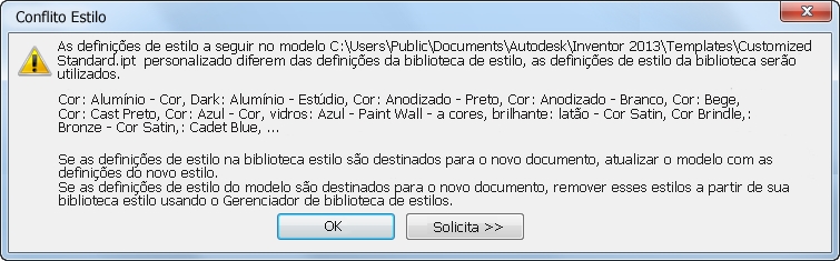 Para evitar essa advertência, consulte Mensagem de conflito de estilo publicada no blog do suporte do produto do Inventor, Being Inventive .