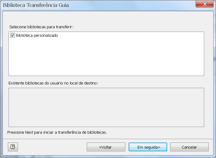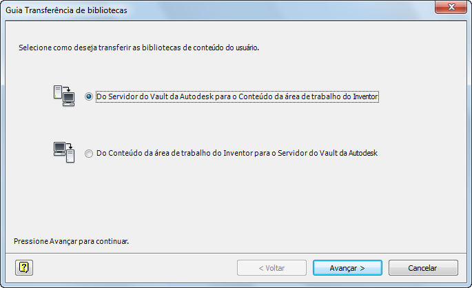 - Clique no botão "Guia de transferência de biblioteca..." para iniciar a caixa de diálogo Guia de transferência de biblioteca. Consulte Figura 2. Selecione a opção Do servidor do Autodesk Vault para Conteúdo da área de trabalho do Inventor.