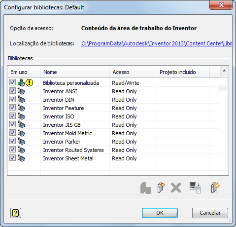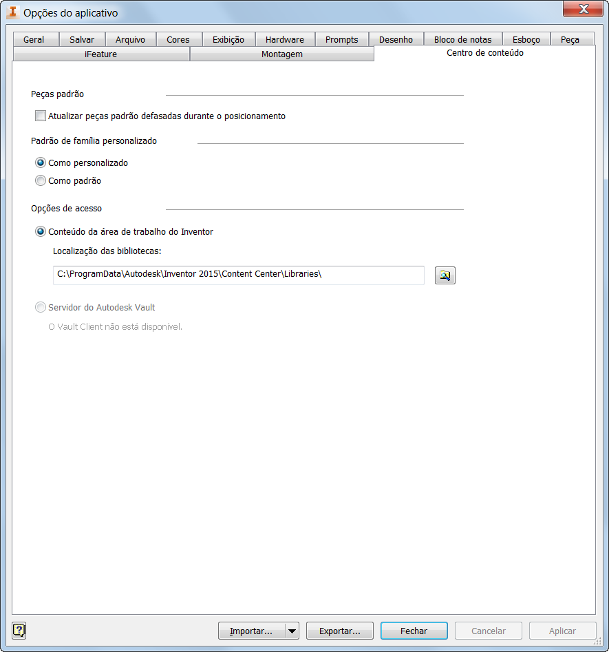 A localização padrão do Conteúdo da área de trabalho do Inventor é a pasta C:\ProgramData\Autodesk\Inventor <versão> \Content Center\Libraries ou C:\Documentos e Configurações\Todos os Usuários\Dados de Aplicativos\Autodesk\Inventor <versão>\Content Center\Libraries. É possível alterar essa localização padrão por meio de Opções do aplicativo, guia Centro de Conteúdo. Observe a imagem anterior.