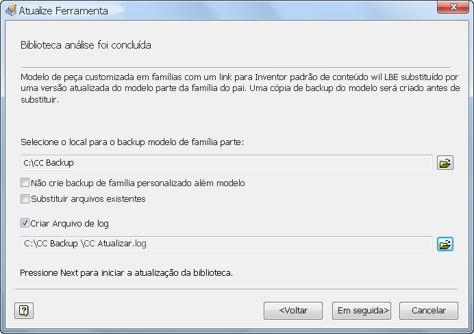 A análise da biblioteca é executada e os resultados da análise são exibidos. Se algum problema for encontrado, será preciso solucionar para continuar. Se não forem detectados erros, as opções de Backup serão exibidas. Especifique uma pasta para criar um backup e clique em Avançar.