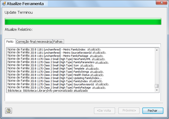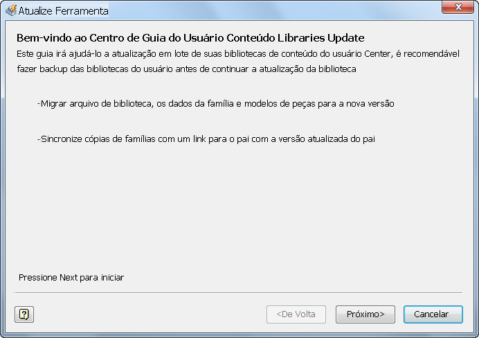 Dica (referências Cruzadas entre as bibliotecas ): Se houver uma referência cruzada e houver uma biblioteca de usuário (UL1) que inclua famílias de origem para as famílias na biblioteca de usuário UL2 e UL2 incluir famílias de origem para famílias na biblioteca de usuário UL1, anexe ambas as bibliotecas e execute a ferramenta de atualização passo a passo para UL1 e UL2.
