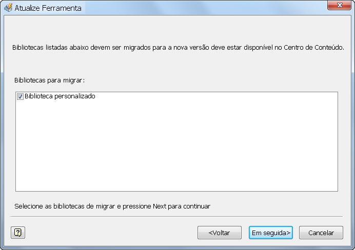 Selecione a biblioteca a ser atualizada. Se mais de uma biblioteca de usuário estiver desatualizada, é possível selecionar várias bibliotecas a serem atualizadas no mesmo processo. A seguir, clique em Avançar.