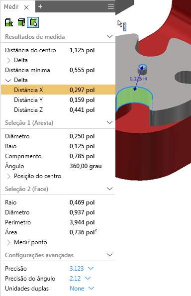 - Distância entre duas das seguintes geometrias: linhas/eixos, arcos/círculos, splines e qualquer tipo de superfície Clique para selecionar a primeira geometria e, em seguida, clique novamente para selecionar a segunda.