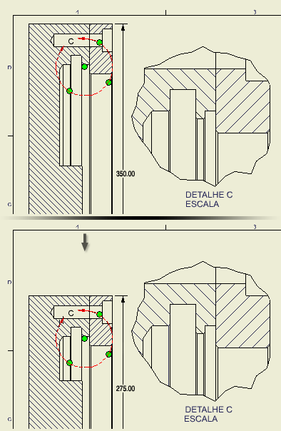 O comando Associar associa as definições de vista de detalhe à vista principal no ambiente de desenho. Se as cotas ou as relações de posição da geometria da vista principal forem alteradas, a definição da vista de detalhe associada permanecerá associada com o vértice de associação especificado pelo usuário e será movida com ele.