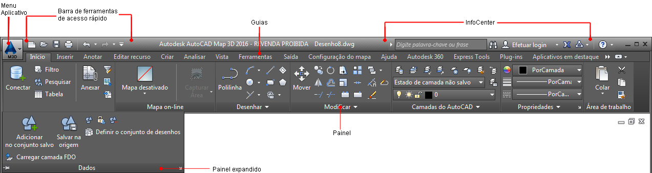 No AutoCAD Map 3D, as guias na parte superior da janela do aplicativo são chamadas de uma faixa de opções.
