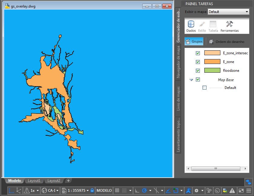 Este mapa sobrepõe duas camadas (uma zona de inundação e uma zona empresarial). É possível usar a sobreposição para ver onde os dois efetuam a intersecção. Essa área se torna uma nova camada, que é possível estilizar e salvar para um arquivo e usar como um novo armazenamento de dados.
