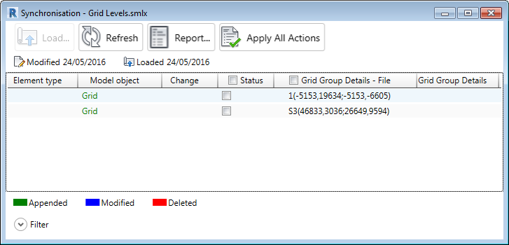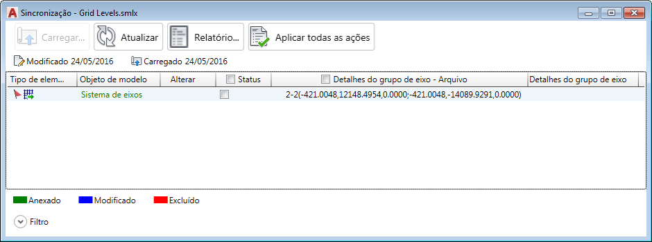 Após carregar o formato .smlx do Revit, a caixa de diálogo Sincronização do Advance Steel exibirá o seguinte: