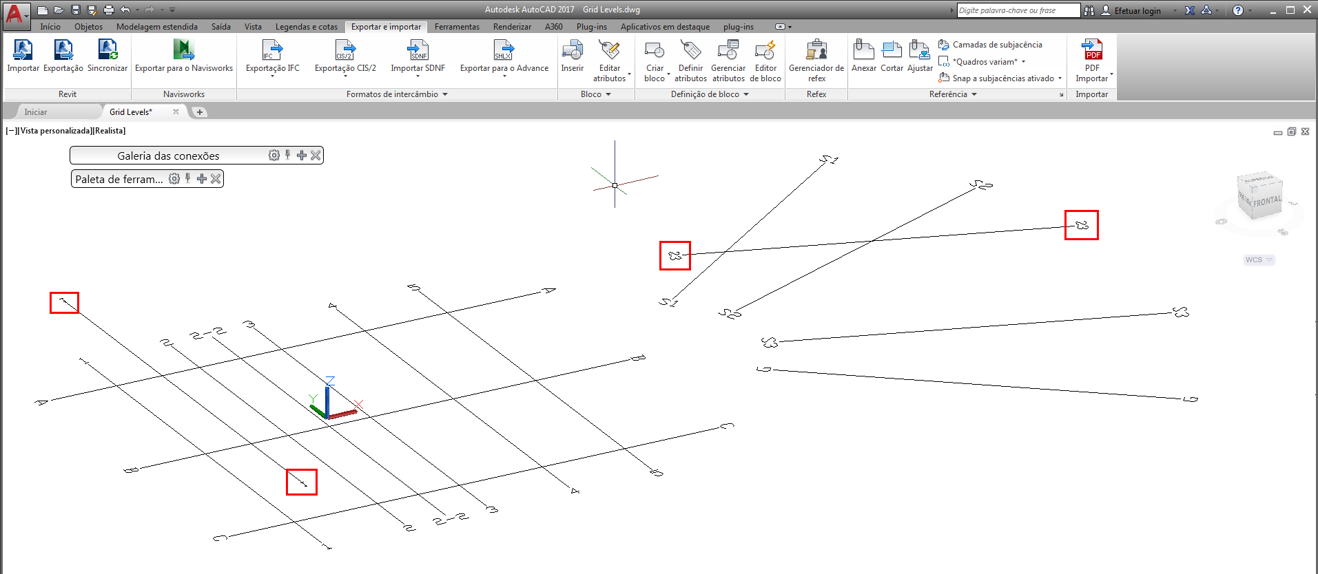 No exemplo a seguir, há um eixo criado no Revit, visível no Nível 1 e Nível 2: