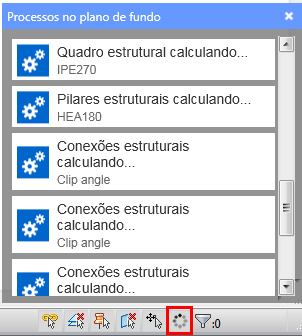No canto inferior direito da plataforma, há um ícone de circulo giratório que indica quando o processo no plano de fundo está realizando o cálculo. Se você clicar no ícone do circulo giratório, a caixa de diálogo Processos no plano de fundo será exibida. Esta caixa de diálogo fornece informações sobre o que está sendo calculado no momento (conexão e nome do tipo de elemento).