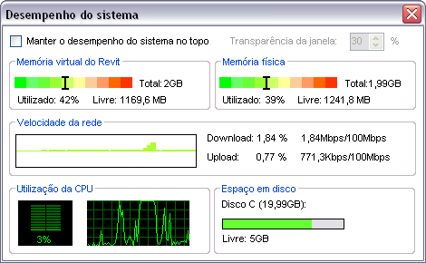 Seu trabalho em um projeto do Revit pode ser afetado pela disponibilidade de recursos do sistema, tal como a memória física, memória virtual, carga da CPU e espaço em disco. É possível utilizar o Monitor de recursos do sistema para monitorar estes recursos.