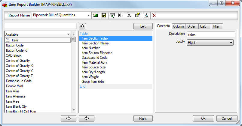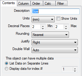 Print Object Details: a seção à direita exibe os detalhes do Objeto de impressão realçado na Exibição do conteúdo do relatório. Esta informação é organizada nas guias Contents, Column, Order, Calc e Filter, descrito abaixo.