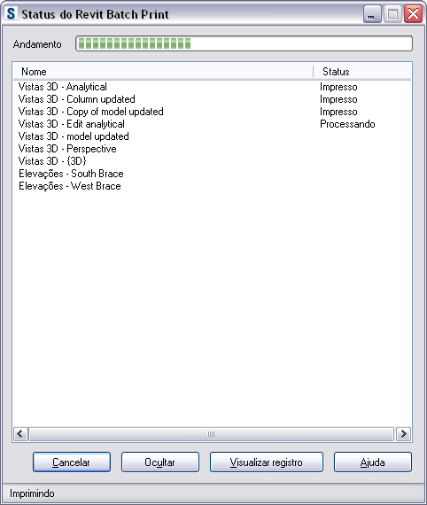 Se desejar monitorar o andamento de um trabalho de impressão, utilize a caixa de diálogo Status do Batch Print do Revit.