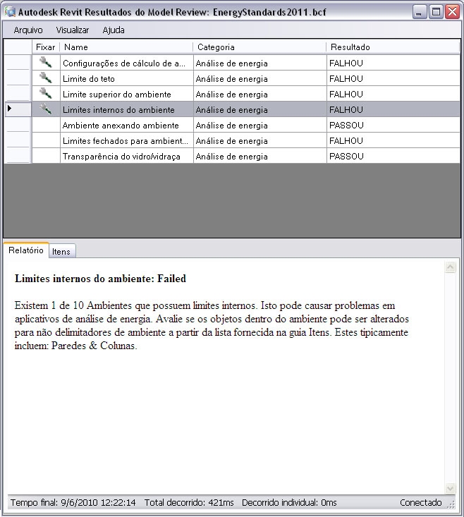 A guia Itens oferece informações mais específicas sobre os resultados da verificação. Permite selecionar um item da lista e, a seguir, utilizar o Revit para encontrar a melhor vista para ajustar/editar onde a origem do problema está localizada para revisão ou correção manual.