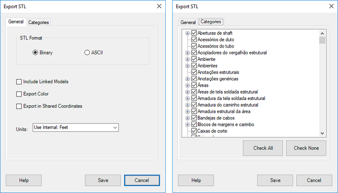 Na guia Categorias, selecione quais as categorias de elementos serão exportadas para o arquivo STL.