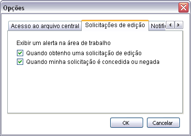 Selecione uma opção para indicar se deseja receber alertas na área de trabalho quando alguém lhe envia solicitações de edição ou quando uma de das solicitações de edição é concedida ou negada. Desmarque uma opção para evitar receber alertas na área de trabalho.