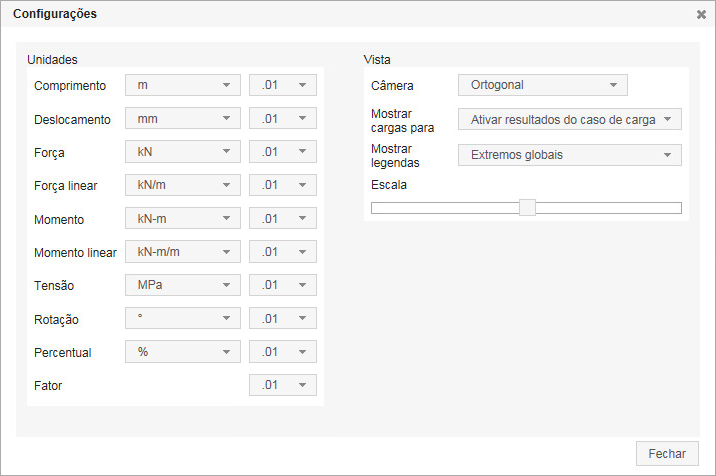 Abrir configurações para abrir a caixa de diálogo Configurações, onde é possível especificar as configurações da unidade dos resultados exibidos na vista, assim como outras configurações de exibição do modelo e dos resultados.