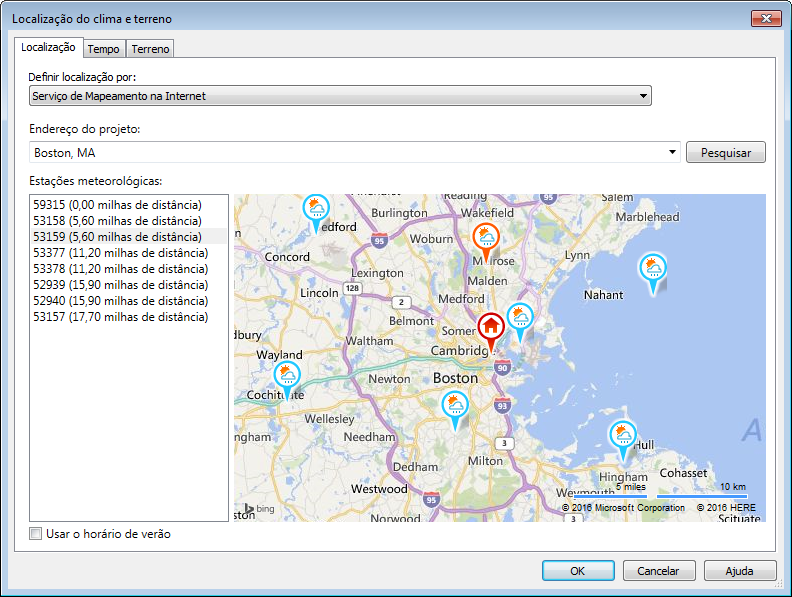 As estações climáticas disponíveis são exibidas no mapa e na lista à esquerda. Em geral, você deve escolher uma estação climática mais próxima à sua localização. No entanto, você pode desejar selecionar uma estação climática próxima cuja elevação e recursos de terra ou água melhor refletem a localização do modelo.