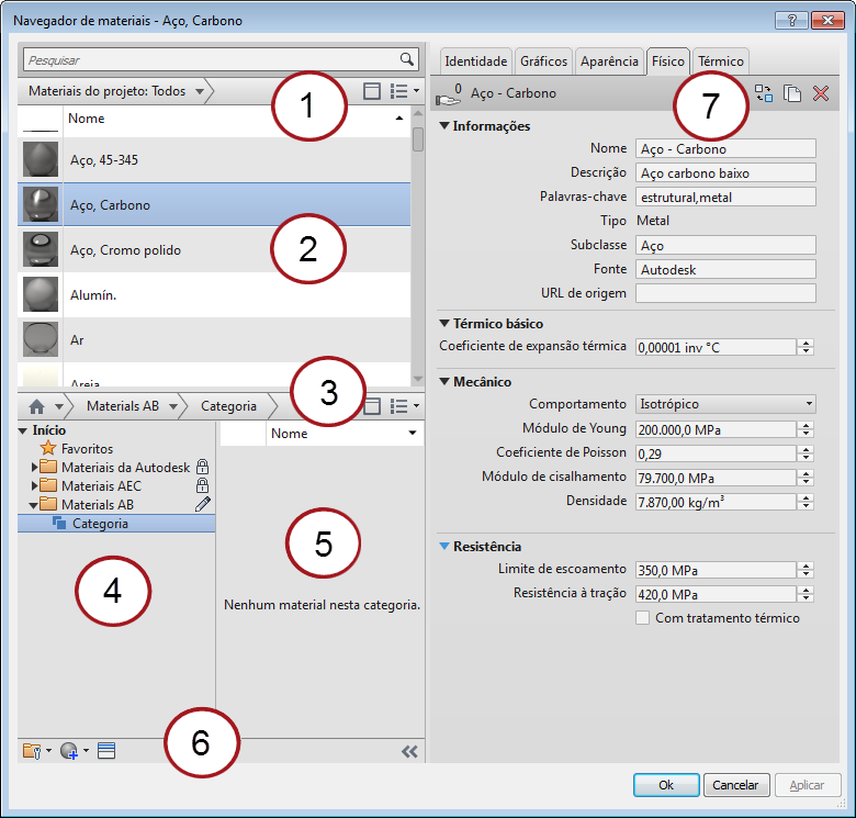 5 | Lista de materiais: exibe os materiais na biblioteca ou a categoria (classe) selecionados na lista da biblioteca. |
