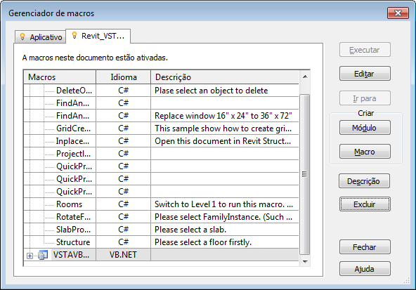 Essas macros foram pré-configuradas para serem executadas no Revit. No Gerenciador de macros, também é possível selecionar qualquer uma das macros de amostra e clicar em Editar para visualizar a codificação criada para executar aquela amostra. Também é possível selecionar qualquer uma das macros de amostra e clicar em Editar para visualizar a codificação criada para executar aquela amostra.