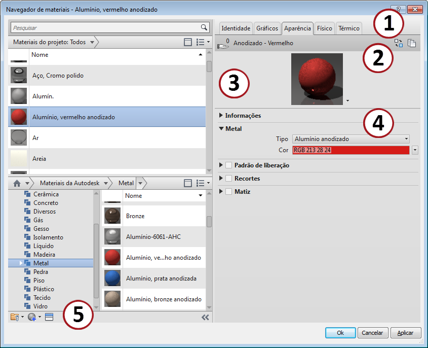 4 | Painel Propriedades: visualizar e gerenciar propriedades detalhadas do recurso selecionado. O nome e descrição do recurso são exibidos abaixo do painel suspenso Informações. O exemplo acima mostra as propriedades do Metal sendo exibidas (expandidas) para o recurso Aparência "Anodizado - Vermelho". |