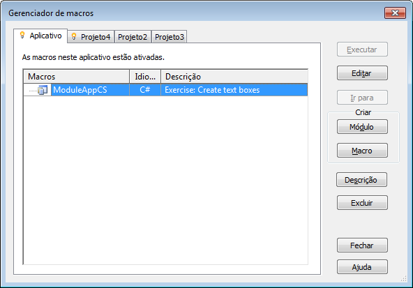 Nota: Se o aplicativo ou o documento atual já contêm módulos, as macros precisam estar ativadas nas configurações de Segurança de macro.