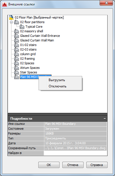 Прим.: Кроме того, можно вывести внешние ссылки на экран, открыв конструкцию в области чертежа AutoCAD Architecture и воспользовавшись Диспетчером ссылок AutoCAD.