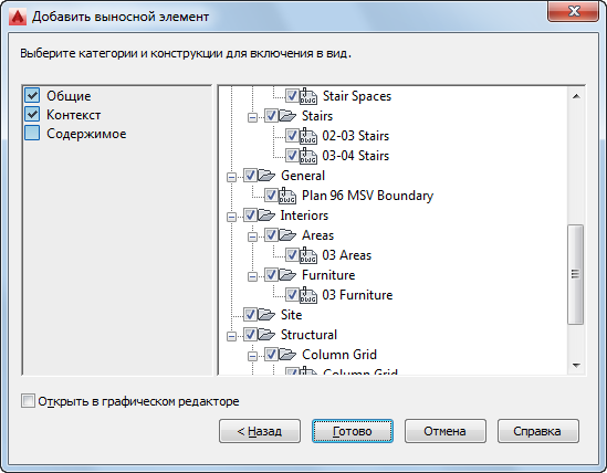 выбрать целую категорию для внесения ее в чертеж "Вид", | выберите категорию. Все конструкции этой категории будут выбраны автоматически. Если позднее к категории будут добавлены новые конструкции, они будут внесены в чертеж "Вид". |