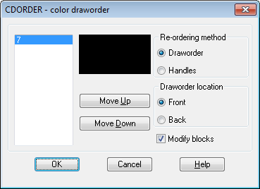 | Handles (Obsolete) | Формирование порядка прорисовки выбранных объектов путем переупорядочения объектов в базе данных чертежа. Объекты удаляются и воссоздаются в порядке, задаваемом в зависимости от их цвета. |