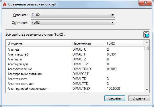 Окно используется для сравнения свойств двух размерных стилей или просмотра перечня всех свойств одного стиля.