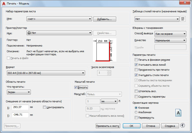 Задание ориентации чертежа для плоттеров, поддерживающих ее книжный и альбомный варианты. Текущая ориентация выбранного листа иллюстрируется значком. Буква на значке указывает на расположение чертежа на листе.