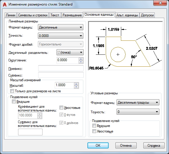 Установка формата и точности основных единиц, а также префиксов и суффиксов размерного текста.
