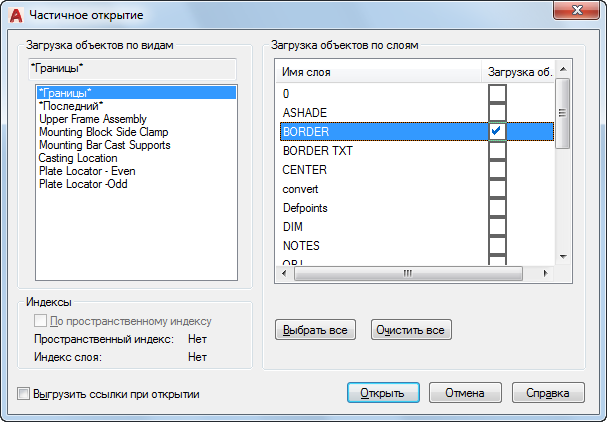 В окне отображаются списки видов и слоев, доступных для подгрузки в частично открытый чертеж.